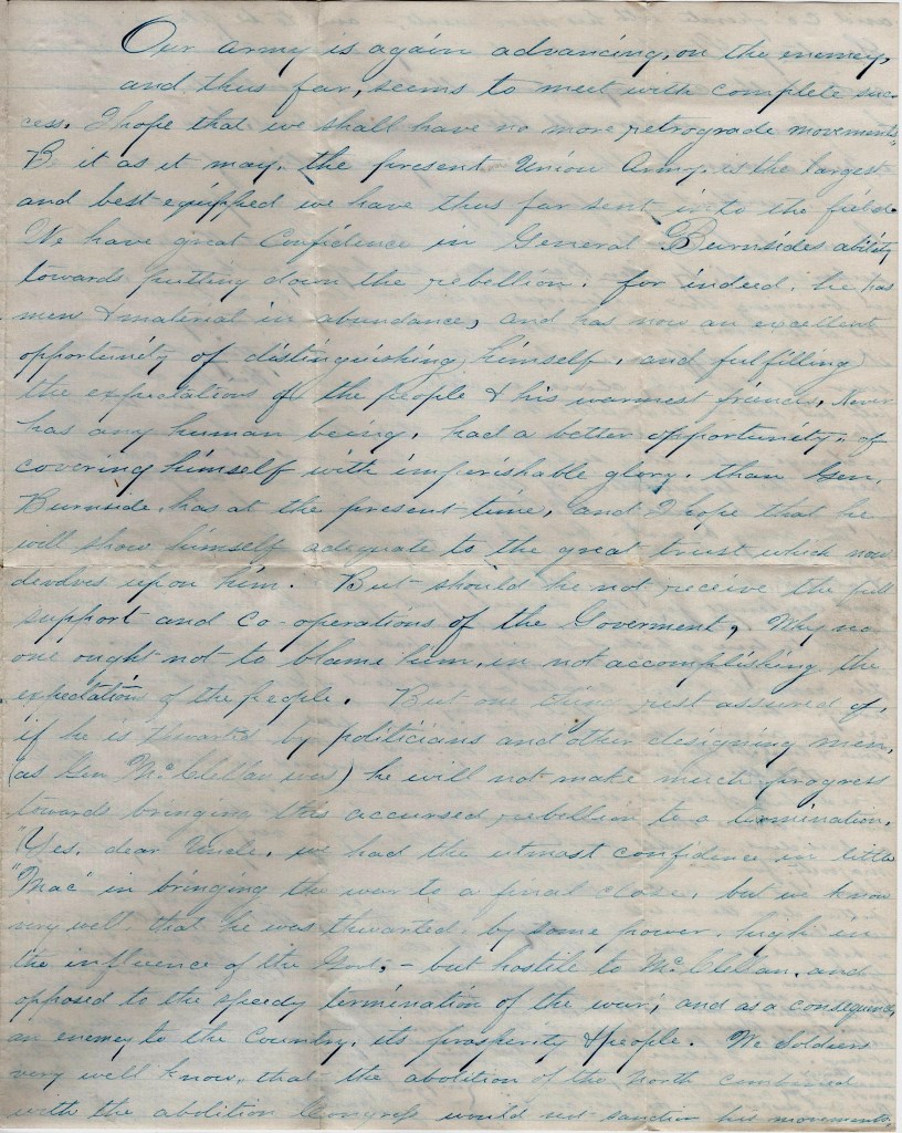 Our army is again advancing on the enemy and thus far seems to meet with complete success. I hope that we shall have no more retrograde movements. Be it as it may, the present Union Army is the largest and best equipped we have thus far sent into the field. We have great confidence in General Burnside’s ability towards putting down the rebellion for indeed, he has men and materiel in abundance, and has now an excellent opportunity of distinguishing himself and fulfilling the expectations of the people and his warmest friends. Never has any human being had a better opportunity of covering himself with imperishable glory than Gen. Burnside has at the present time, and I hope that he will show himself adequate to the great trust which now devolves upon him. But should he not receive the full support and cooperation of the government, why no one ought not to blame him in not accomplishing the expectation of the people. But one thing rest assured of, if he is thwarted by politicians and other designing men (as Gen. McClellan was) he will not make much progress towards bringing this accursed rebellion to a termination.