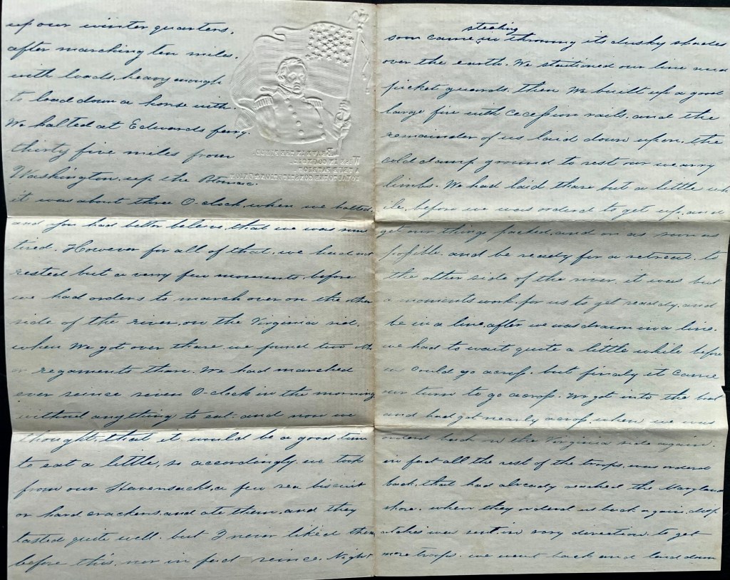 One week ago last Monday we packed up our knapsacks and other fixings too numerous to mention for a long and weary march. We was going somewhere to join the rest of the brigade and take up our winter quarters. After marching ten miles with loads heavy enough to load down a horse with, we halted at Edwards Ferry, thirty-five miles from Washington up the Potomac. It was about three o’clock when we halted and you had better believe that we was some tired. However, for all of that, we had not rested but a very few moments before we had orders to march over on the other side of the river—-on the Virginia side. When we got over there we found two other regiments there.1 We had marched ever since seven o’clock in the morning without anything to eat and now we thought that it would be a good time to eat a little. So accordingly we took from our haversacks a few sea biscuit or hard crackers and ate them and they tasted quite well. But I never like them before this, nor in fact since.