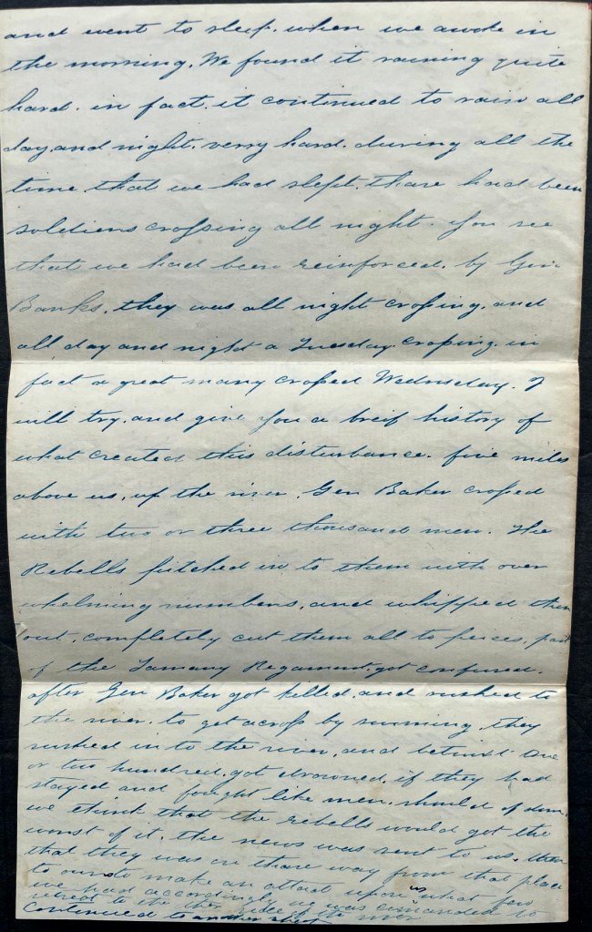 I will try and give you a brief history of what created this disturbance five miles abofve us, up the river. Gen. [Edwin Dickinson] Baker crossed with two or three thousand men. The Rebels pitched into them with overwhelming numbers and whipped them out, completely cut them all to pieces. Part of the Tamany Regiment got confused after Gen. Baker got killed and rushed to the river to get across by swimming. They rushed into the river and betwixt one or two hundred got drowned. If they had stayed and fought like men should of done, we think that the rebels would got the worst of it. The news was sent to us then that they were on their way from that place to ours to make an attack upon us—what few we had. Accordingly we was commanded to [retreat]. But as good luck would have it, we was not molested during the night.