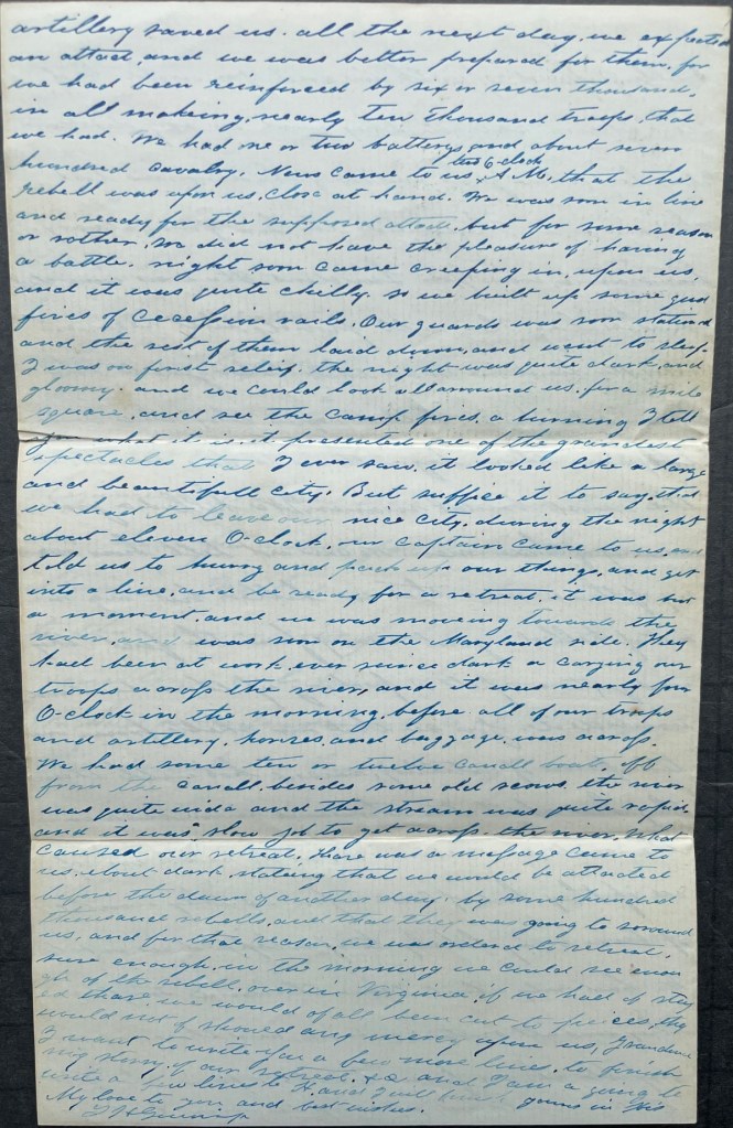 Night soon came creeping in upon us and it was quite chilly so we built up some good fires of secession rails. Our guards was soon stationed and the rest of them laid down and went to sleep. I was on first relief. The night was quite dark and gloomy and we could look all around us for a mile square and see the camp fires a burning. I tell you what, it presented one of the grandest spectacles that I ever saw. It looked like a large and beautiful city. But suffice it to say that we had to leave our nice city. During the night about eleven o’clock, our captain came to us and told us to hurry and pack up our things and get into line and be ready for a retreat. It was but a moment and we was moving towards the river and was soon on the Maryland side. They had been at work ever since dark a carrying our troops across the river and it was nearly four o’clock in the morning before all of our troops and artillery, horses, and baggage was across.
