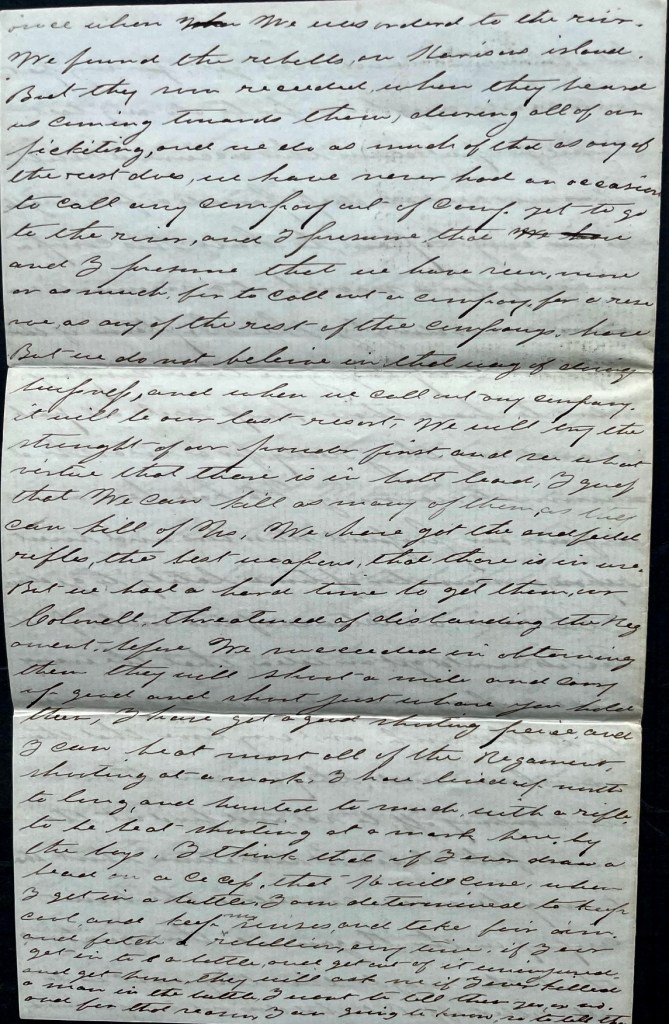 We have got the Enfield rifles—the best weapons that there is in use. But we had a hard time to get them. Our Colonel threatened of disbanding the regiment before we succeeded in obtaining them. They will shoot a mile and [ ] and shoot just where you hold them. I have got a good shooting piece and I can beat most all of the regiment shooting at a mark. I have lived up north too long and hunted too much with a rifle to be beat shooting at a mark here by the boys. I think that if I ever draw a bead on a secesh, that he will [ ]. When I get in a battle, I am determined to keep cool and keep my senses and take fair aim and fetch a rebellion every time. If I ever get into a battle and get out of it uninjured and get home, they will ask me if I ever killed a man in the battle, I want to tell them yes, and for that reason I am going to know, so to tell them.