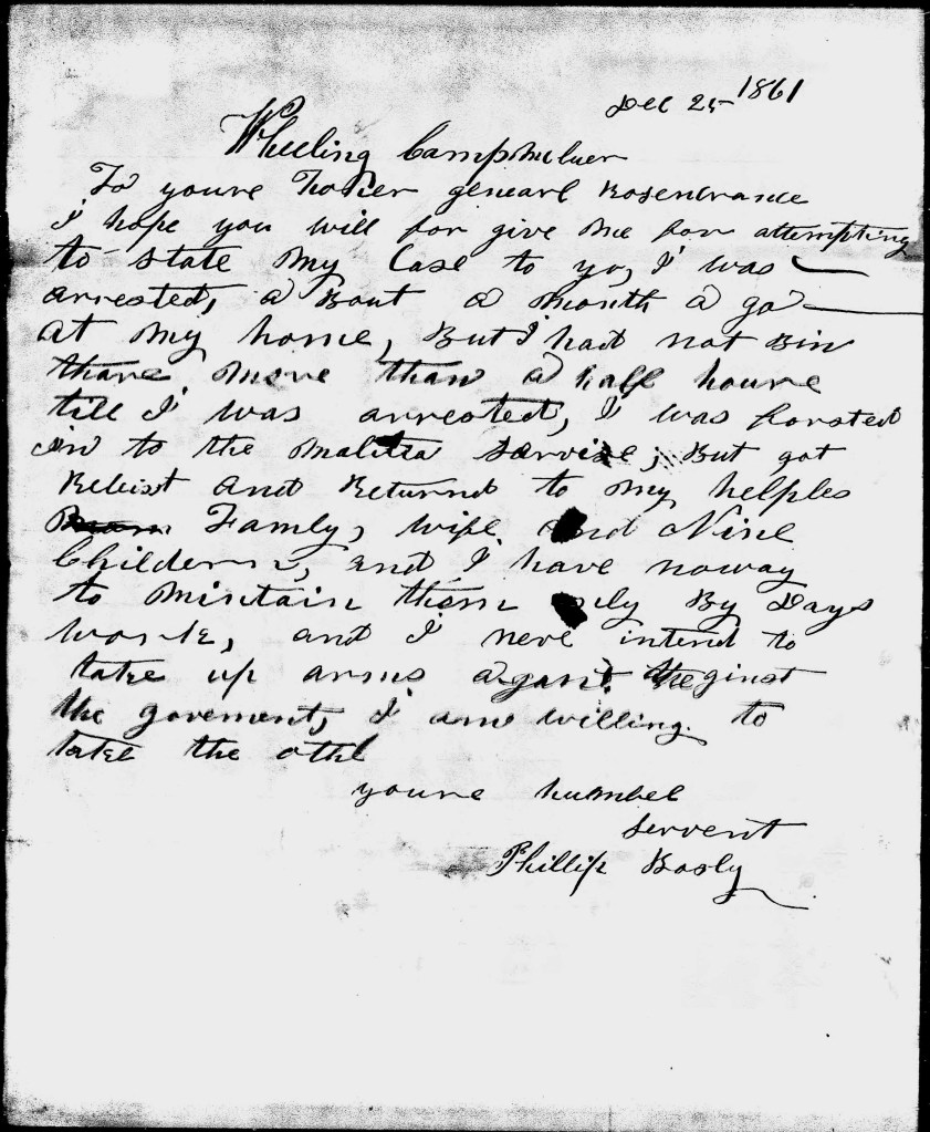 There’s no evidence that Terry’s ancestor ever served officially in the Confederate service prior to or subsequent to his arrest, though he may have engaged in some guerrilla activity if the family bore anti-administration sentiments as Terry claims they did. Whether Rosecrans acted on Bosley’s Christmas Day petition for clemency is unknown but he was undoubtedly released sometime not long after as this part of Virginia fell under strong Union control by the spring of 1862 and most of its citizens lived unmolested.