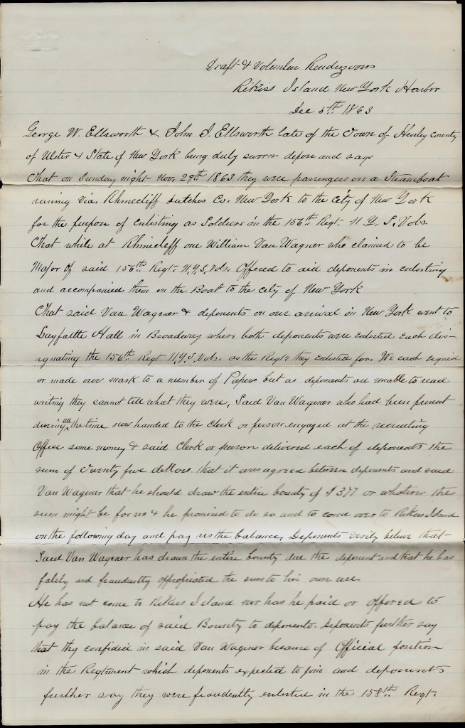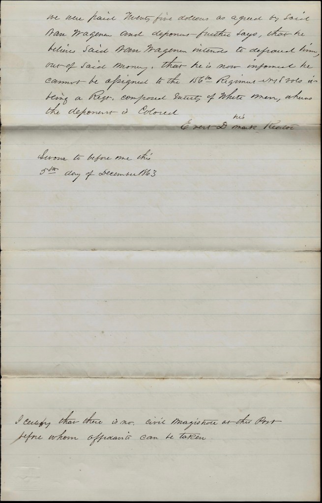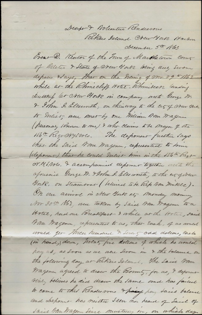Evert D. Keator of the town of Marbletown, County of Ulster, & State of New York, being duly sworn, deposes and says, that on the evening of Nov. 29th, 1863, while at the Rhinecliff House, Rhinecliff, Dutchess county, New York,in company with George W. & John J. Ellsworth, on the way to the City of New York to enlist, they were met by one William Van Wagenen (personally known to deponent) & claims to be Major of the 156th N. Y. S. Vols. The deponent further says that the said Van Wagenen represented to him he could enlist him in the 156th N. Y. S. Vols. and accompanied deponent & the aforesaid George W. & John I. Ellsworth to the City of New York on steamboat believed to be the Rip Van Winkle. On our arrival in the City of New York, Monday morning, November 30th 1863, were taken to a hotel by said Van Wagenen, had our breakfast and while at the hotel, said Van Wagenen represented to us that each of us would get three hundred and seventy odd dollars cash down, twenty-five of which he would pay as soon as we were mustered or sworn in & the balance on the following day at Riker’s Island. That said Van Wagenen, the two Ellsworths & myself, then went to Lafayette Hall in Broadway, New York, where the Ellsworths & myself enlisted, each of us designating the 156th Regiment as the regiment we enlisted for. We each signed or made our marks to a number of papers but as deponent cannot read writing, he cannot tell what they were. Said Van Wagenen, who had been present during all the time, now handed to a clerk, a person engaged at the recruiting office, some money and said clerk or person immediately handed to each of the two Ellsworths and myself the sum of twenty-five dollars. That it was agreed between us and aforesaid Van Wagenen that he should draw the entire bounty of $377 or whatever the sum might be for us, & promised to do so and come to Riker’s Island on the following day & pay us the balance. Deponent verily believes that the said Van Wagenen has drawn the entire bounty due the deponent and that he has falsely and fraudulently appropriated the same to his own use. He has not come to Riker’s Island nor has he paid or offered to pay the balance of said bounty to deponent. Deponent further says that he confided in said Van Wagenen because of his official position in the regiment which deponent expected to join. Deponent further says he is now informed he cannot be assigned to the 156th Regiment, that being composed entirely of White men whereas the deponent is Colored.