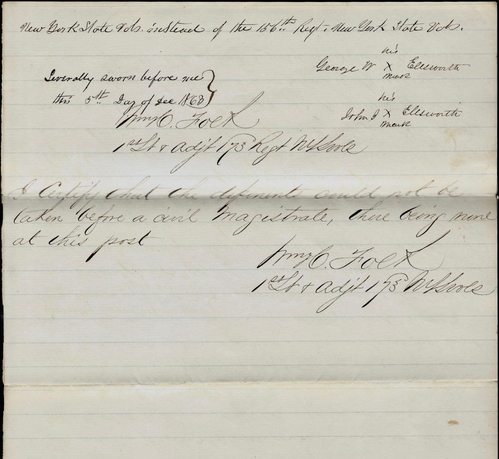 I certify that the deponent could not be taken before a civil magistrate, there being none at this post. – Wm. H. Folk, 1st Lt. & Adjt. 173rd N. Y. S. Vols.