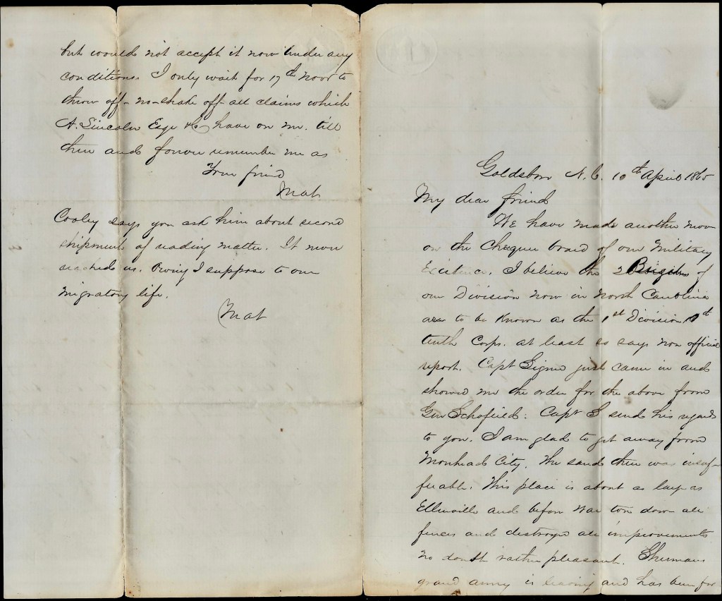 We have made another move on the checker board of our military existence. I believe the 2nd Brigade of our Division now in North Carolina are to be known as the 1st Division, Tenth Corp. at least so say non official report. Capt. [Isaac L.] Signer [of Co. F] just came in and showed me the order for the above from Gen. Schofield. Capt. Signer sends his regards to you. I am glad to get away from Morehead City. The sand there was insufferable. This place is about as large as Ellsworth and before war torn down all fences and destroyed all improvements, no doubt rather pleasant. Sherman’s grand army is leaving and has been for the last 24 hours with 20 days rations and well equipped with all the “materiel” of war. If Johnston don’t move rapidly, Sherman will gobble him up. Sheridan with his gallant cavalry in the van of Lee will no doubt disperse his forces and I look for a speedy dissolution of the rebel armies.