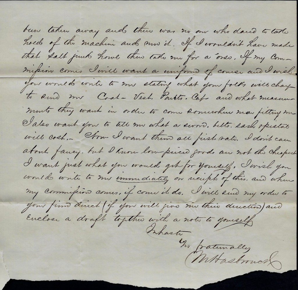 I wish I had held a commission a few days since. Our Brigade Commissary has been taken away and there was no one who dared to take hold of the machine and run it. If I wouldn’t have made that salt junk howl, then take me for a ‘orse. If my commission comes, I will want a uniform of course and I wish you would write to me stating what your folks will charge to send me a coat, vest, pants, cap and what measurements they want in order to come somewhere near fitting me. I also want you to tell me what a sword, belts, sash and pistol will cost. Now I want them all first rate. I don’t care about fancy but I know low priced goods are not the cheapest. I want just what you would get for yourself. I wish you would write to me immediately on receipt of this and when my commission comes, it come it do, I will send my order to your firm direct (if you will give me their direction) and enclose a draft together with a note to yourself. In haste.