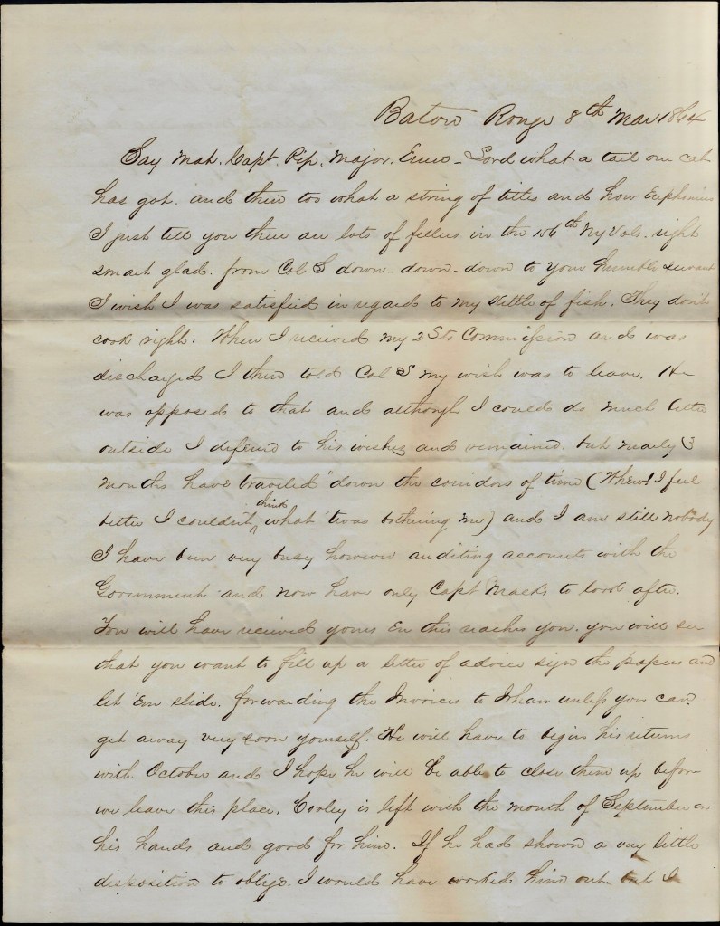 Say Mat, Capt. Rip, Major Euen, Lord what a tail our cat has got and then too what a string of titles and how euphonious. I just tell you, there are lots of fellers in the 156th N. Y. Vols right smart glad from Col. Sharpe down, down, down to your humble servant. I wish I was satisfied in regard to my kettle of fish. They don’t cook right. When I received my 2nd Lt. commission and was discharged, I then told Col. Sharpe my wish was to leave. He was opposed to that and although I could do much better outside, I deferred to his wishes and remained, but nearly 3 months have traveled “down the corridors of time” (whew! I feel better I couldn’t think what ’twas bothering me) and I am still nobody. I have been very busy however auditing accounts with the Government and now have only Capt. Mack’s to look after. You will have received yours ‘ere this reaches you. You will see that you want to fill up a letter of advice, sign the papers, and let ’em slide, forwarding the invoices to Johan [Lefevre] unless you can get away very soon yourself. He will have to begin his returns with October and I hope he will be able to close them up before we leave htis place. Cooley is left with the month of September on his hands and good for him. If he had shown a very little disposition to oblige, I would have worked him out but I thought he acted very much as though he would like to see you in a scrape with your returns and I let him go for just his actual value—nothing.