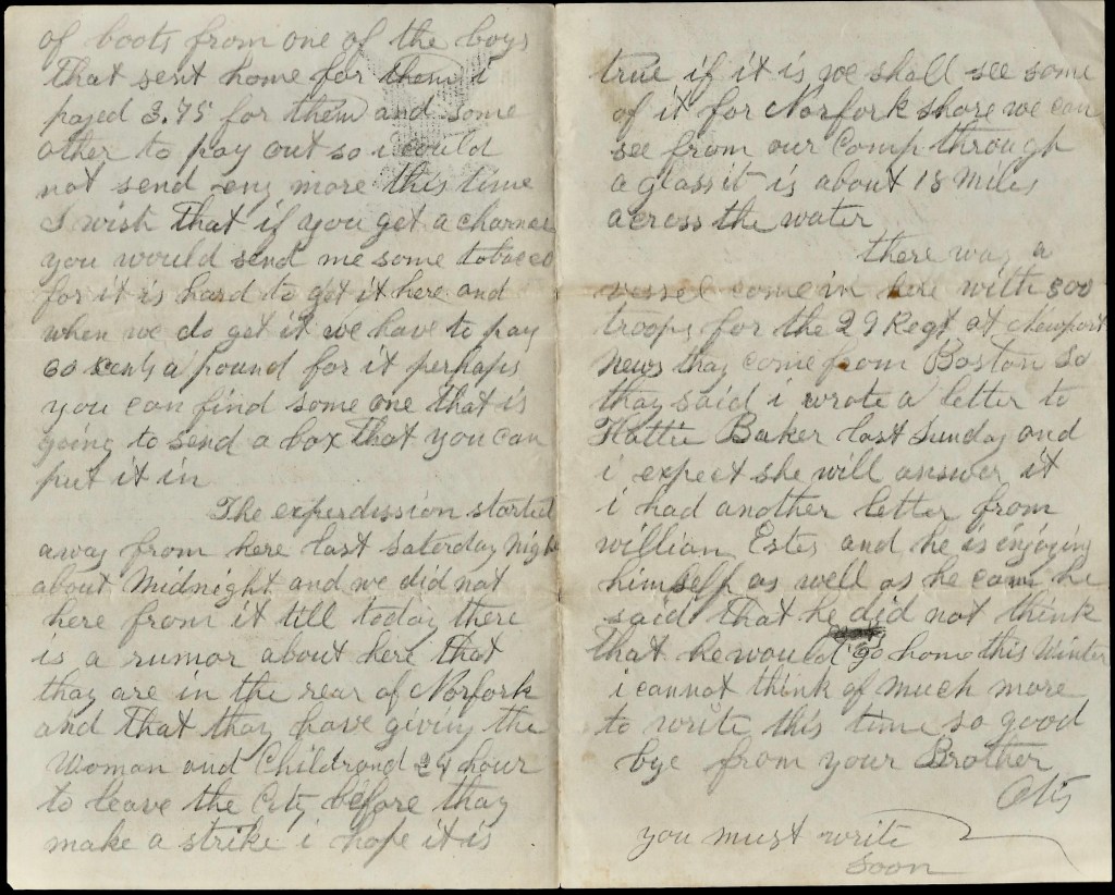 There was a vessel come in here with 500 troops for the 29th [Massachusetts] Regt. at Newport News. They come from Boston so they said. I wrote a letter to Hattie Baker last Sunday and I expect she will answer it. I had another letter from William Estes and he is enjoying himself as well as he can. He said that he did not think that he would go home this winter.