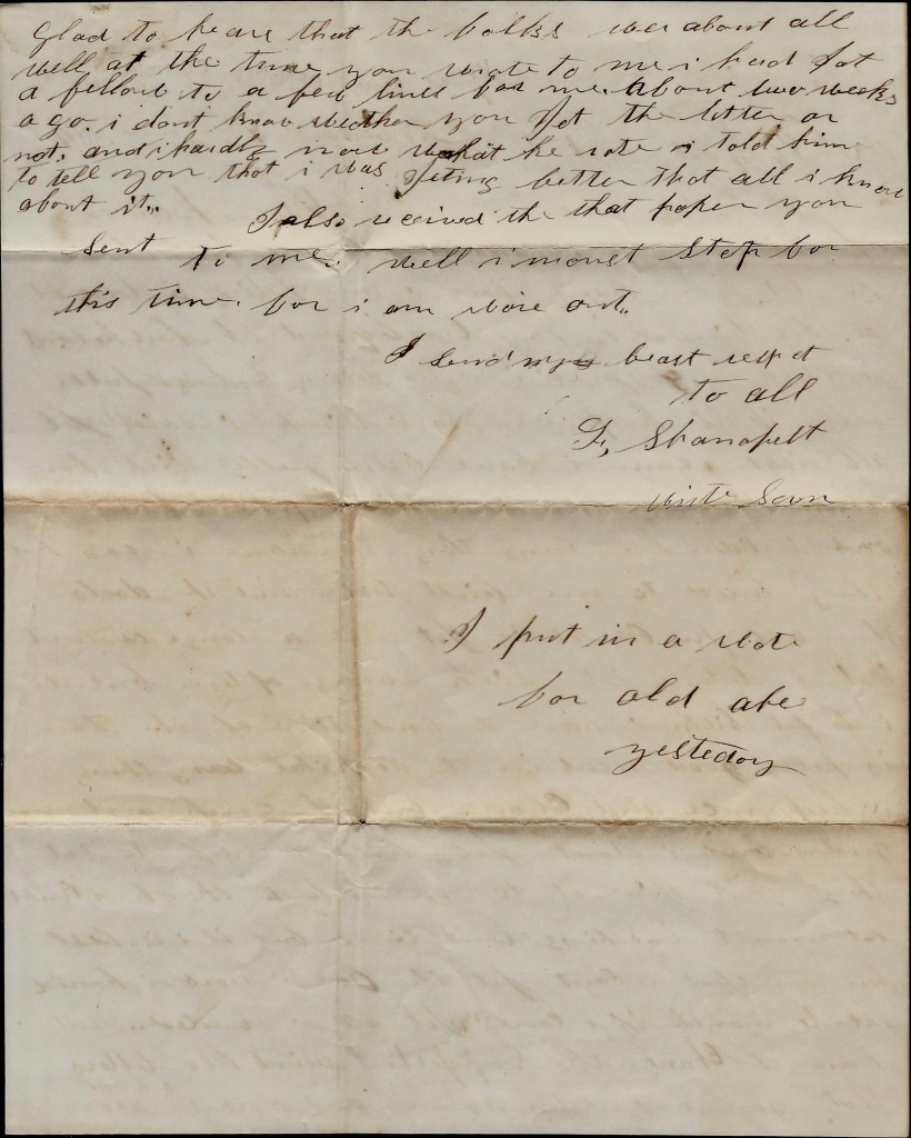Well, I must change the subject. I received two letters that you had written to me and I was very glad to hear that the folks were about all well at the time you wrote to me. I hat got a fellow to write a few lines for me about two weeks ago. I don’t know whether you got the letter or not, and I hardly know what he wrote. I told him to tell you that I was getting better. That’s all I know about it. I also received that paper you sent to me. Well, I must stop for this time for I am wore out. I send you my best respects to all. — F. Shanafelt