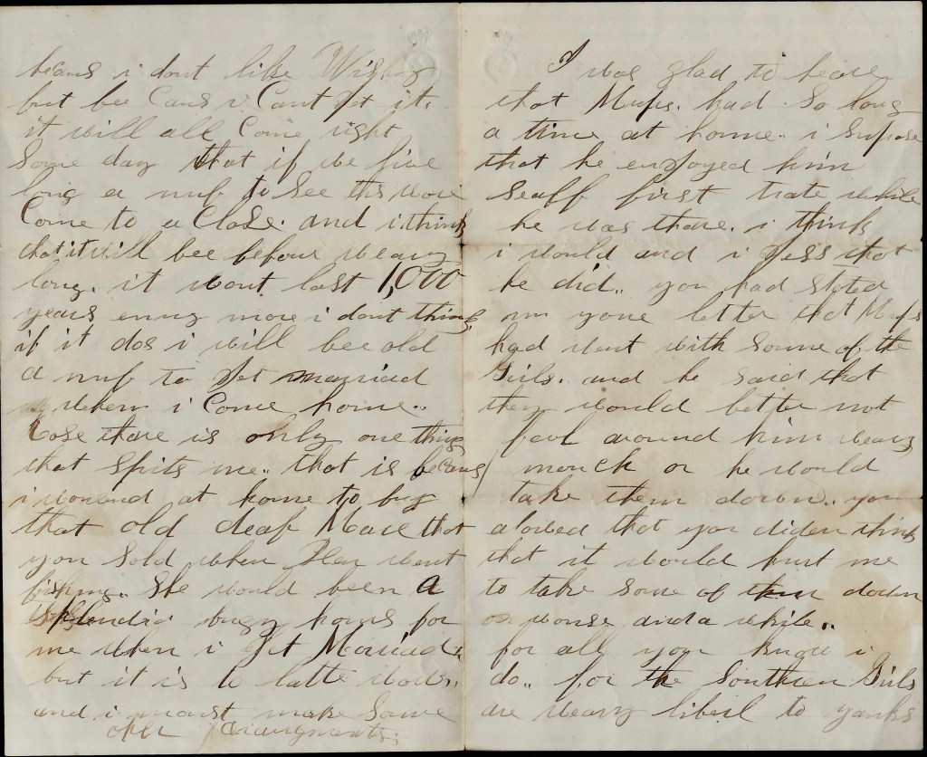I was glad to hear that Mapes had so long a time at home. I suppose that he enjoyed himself first rate while he was there. I think I would and I guess that he did. You had stated in your letter that Mapes had went with some of the girls and he said that they would better not fool around him very much or he would take them down. You allowed that you didn’t think that it would hurt me to take some of them down once and a while. For all you know, I do for the Southern girls are very liberal to Yanks—especially some of them. But it all goes for the Union.