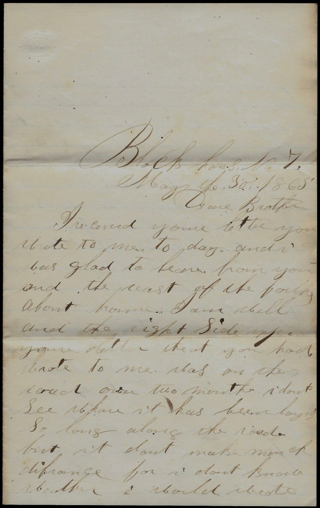 I received your letter you wrote to me today and I was glad to hear from you and the rest of the folks about home. I am well and the rest of the right side up. Your letter that you had wrote to me was on the road over two months. I don’t see where it has been laying so long along the road but it don’t make much difference for I don’t know whether I would wrote any sooner or not for there was a big talk about being mustered out but I think that we will serve out our time or almost at least. We have about three months to serve yet and then our time will be out.