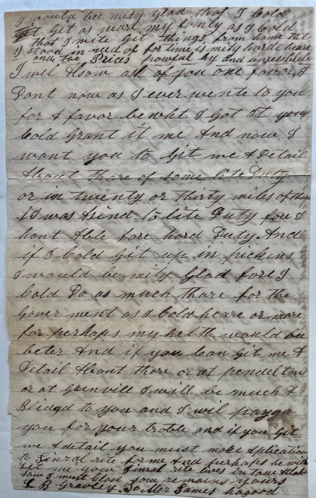 I will now ask of you one favor, I don’t know as I ever went to you for a favor but what I got it. You could grant it me. And now I want you to get me a detail about there of some light duty or in twenty or thirty miles of there. I was assigned to light duty for I han’t able for hard duty. And if I could get up in Pickens, I would be mighty glad for I could do as much there for the government as I could here or more for perhaps my health would be better. And if you can get me a detail all out there or at Pendleton or at Greenville, I will be much obliged to you and I will pay you for your trouble. And if I get me a detail, you must makke application to General Wright for me and perhaps he will let me go. General Wright lives in town Atlanta.