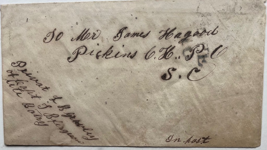 The letter was written to James Earle Hagood (1826-1904) in Pickens. In 1856, Hagood was elected the clerk of the circuit court in Pickens District and he held the position until 1868 when the district was divided. He became a lawyer and a cotton grower.