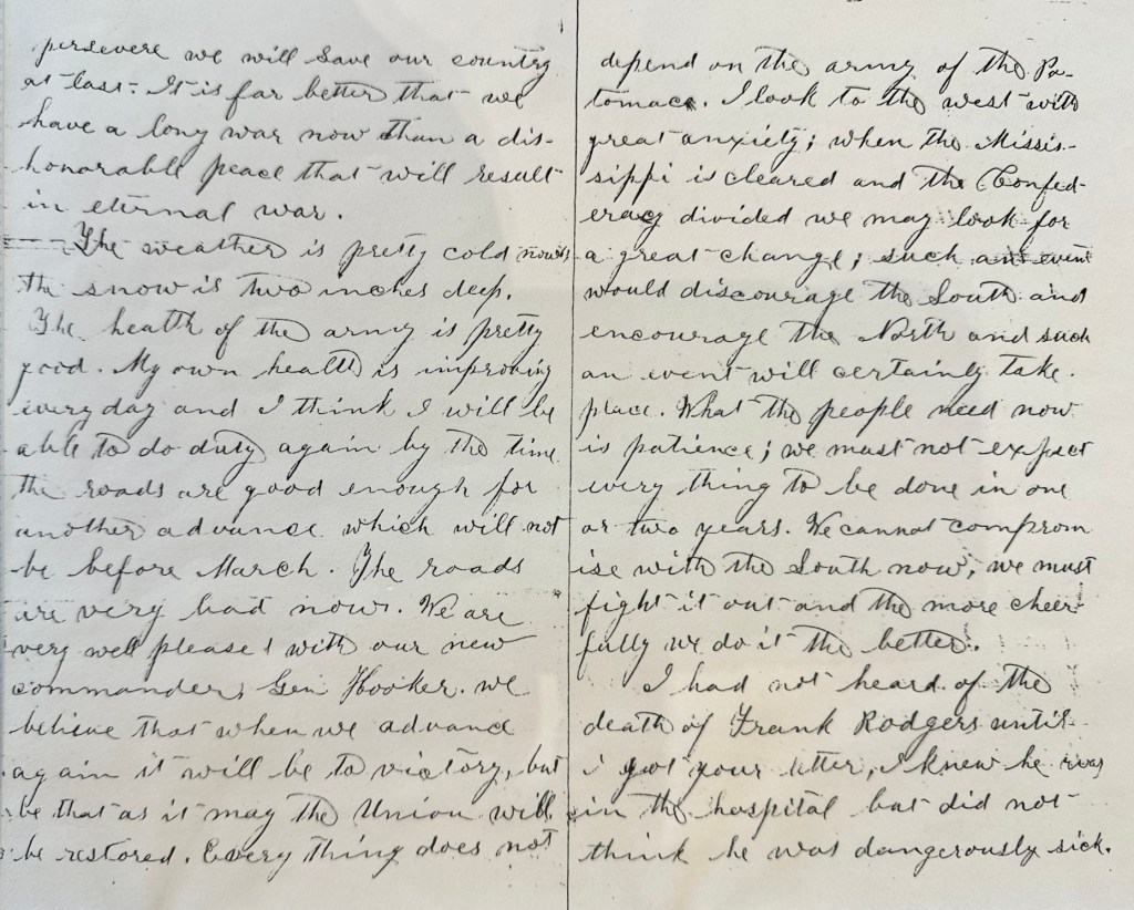 We are very well pleased with our new commander, Gen. Hooker. We believe that when we advance again, it will be to victory. But be that as it may, the Union will be restored. Everything does not depend on the Army of the Potomac. I look to the West with great anxiety. When the Mississippi is cleared and the Confederacy divided, we may look for a great change. Such an event would discourage the South and encourage the North and such an event will certainly take place. What the people need now is patience. We must not expect everything to be done in one or two years. We cannot compromise with the South now. We must fight it out and the more cheerfully we do it the better.