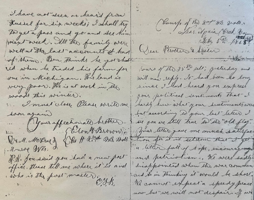 I must close. Please write me soon again. Your affectionate brother, – Elon F. Brown, Co. H, 2nd Wisconsin Vols.