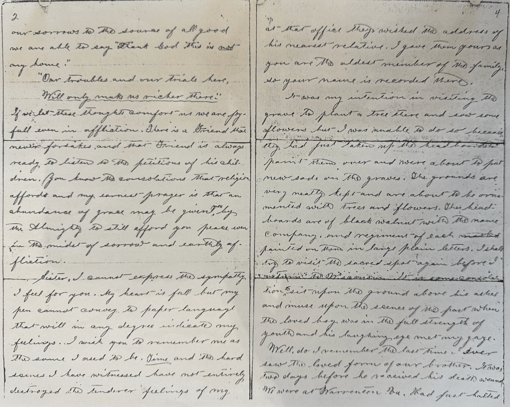 It was my intention in visiting the grave to plant a tree there and sow some flowers but I was unable to do so because they had just taken up the head boards to paint them over and were about to put new sods on the graves. The grounds are very neatly kept and are about to be ornamented with trees and flowers. Their headboards are of black walnut with the name, company, and regiment of each painted on them in large plain letters. I shall try to visit the sacred spot again before I return to Wisconsin. It is some consolation to sit upon the ground above his ashes and muse upon the scenes of the past when the loved boy was in the full strength of youth and his laughing eye met my gaze.