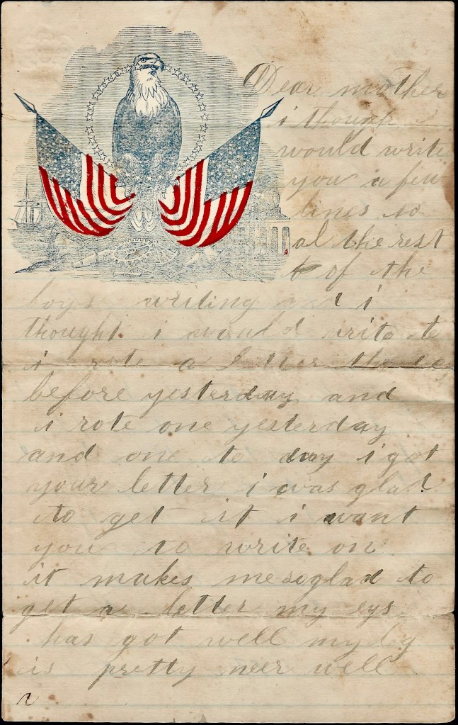 I thought I would write you a few lines as all the rest of the boys [are] writing and I thought I would too. I wrote a letter the day before yesterday and I wrote one yesterday and one today. I got your letter. I was glad to get it. I want you to write one. It makes me so glad to get a letter. My eyes has got well. My leg is pretty near well.