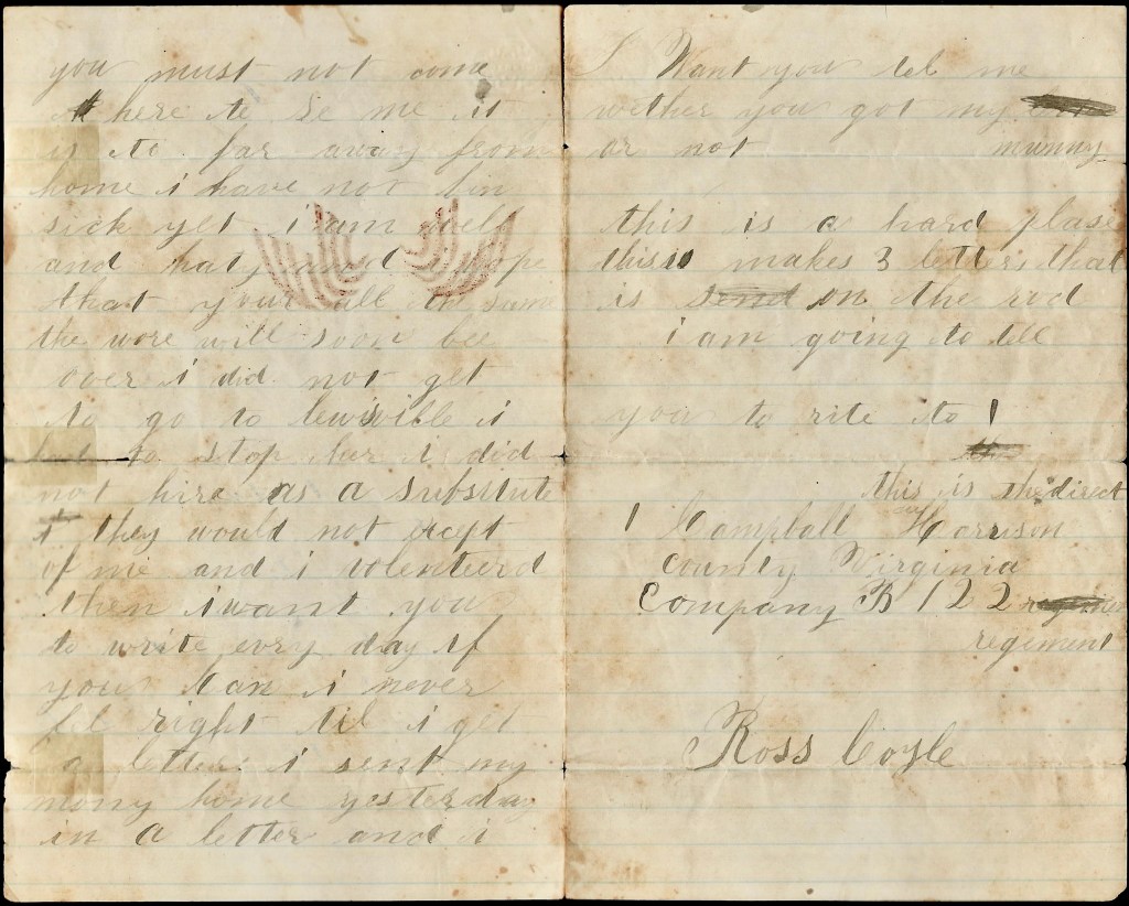 I did not get to go to Louisville. I had to stop here. I did not hire as a substitute. They would not accept of me and I volunteered then. I want you to write every day if you can. I never feel right till I get a letter. I sent my money home yesterday in a letter and I want you tell me whether you got my money or not. This is a hard place. This makes 3 letters that is on the road. I am going to tell you to write. This is the direct: