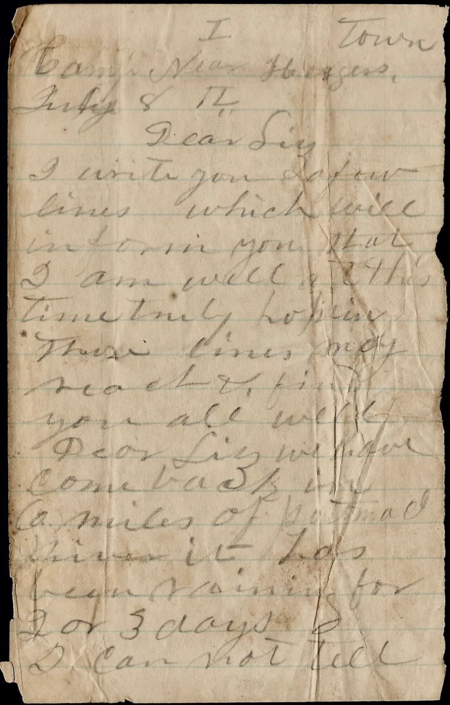 At Gettysburg, the 51st and 53rd Georgia Regiments were brigaded together in Brigadier General Paul J. Semmes Brigade of Major General Lafayette McLaws Division of Longstreet’s 1st Corps. They took part in the fight on Rose Hill and on into the wheat field in support of Kershaw and Anderson late in the afternoon of July 2, 1863. On 4 July 1863 the Confederates began their retreat from Gettysburg and made their way to Hagerstown, Maryland, where this letter was scribbled in pencil on 8 July. The Confederates finally crossed the Potomac on the night of 13 July, delayed by high waters.