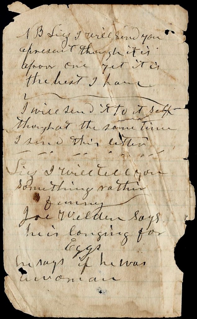 Joel was born in 1819 and appears to have had a couple of different wives; he was married to his second wife, Martha Rice in 1855 in Henry county, Alabama. The letter was addressed to Liz who was undoubtedly the Elizabeth D. to whom the letter was addressed but I cannot account for her in census records. She may have been a wife, a sister, or some other relative. He does mention “Mattie” which could be a nickname for Martha. Joel’s father was no longer living in 1863 but the “Pap” might refer to his father-in-law.