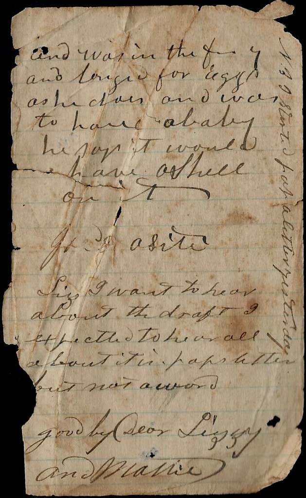 Liz, I want to hear about the draft. I expected to hear all about it in Pap’s letter but not a word. Goodbye dear Lizzy and Mattie