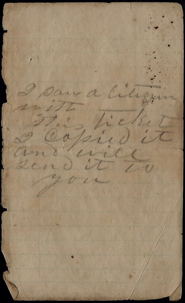 We have hard times now. I saw B. F. Mottes [?]. He was shocked by a [ ]. Crock Akins wounded in leg. 2 Wiley Childers not hurt. 3 J. Brown 4 not hurt. Liz, I must close. Goodbye for this time. I hope to see you again.