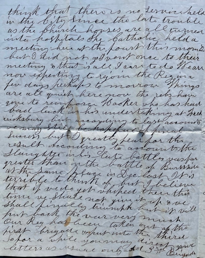 We are now expecting to rejoin the regiment in a few days—perhaps tomorrow. Things are all quiet here now. The rebs have gone to reinforce Hooker who has had bud luck in his undertaking at Fredericksburg but according to last accounts, we may still be hopeful of final success. But I greatly fear for the result. According to accounts, the slaughter in his late battles was far greater than in the battle of Burnside’s. Terrible to think of. But I believe that [even] if we do get whipped there this time, we shall not give up & we shall finally triumph. But it will put back the war very much.