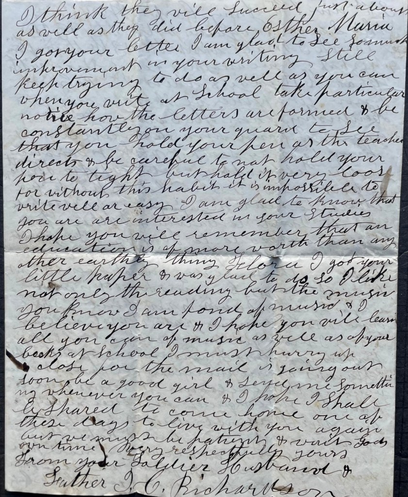 Esther Maria, I got your letter. I am glad to see so much improvement in your writing. Still keep trying to do as well as you can when you write at school. Take particular notice how the letters are formed & be constantly on your guard to see that you hold your pen as the teacher directs & be careful to not hold your pen too tight but hold it very loose for without this habit, it is impossible to write well or easy. I am glad to know that you are interested in your studies. I hope you will remember that an education is of more worth than any other earthly thing.