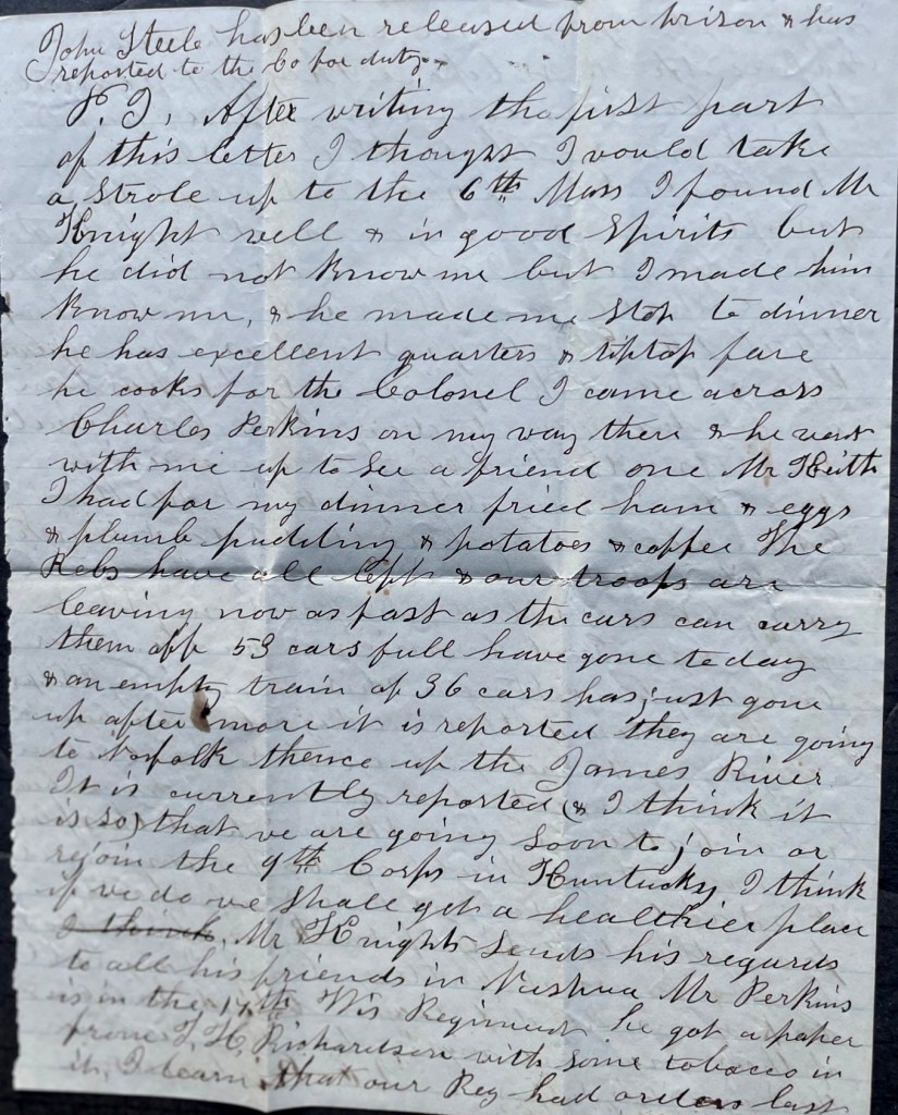 The Rebs have all left & our troops are leaving now as fast as the cars can carry them off. 53 cars full have gone today and an empty train of 36 cars has just gone up after more. It is reported they are going to Norfolk, thence up the James River. It is currently reported (and I think it is so) that we are going soon to join or rejoin the 9th Corps in Kentucky. I think if we do, we shall get a healthier place. Mr. Knight sends his regards to all his friends in Nashua. Mr. Perkins is in the 17th Wisconsin Regiment. He got a paper from T. H. Richardson with some tobacco in it. I learn that our regiment had orders last night to go to our old camp near Falmouth but before they got started, the order was countermanded. But I think most likely that we shall go to Kentucky & if you don’t get letters as often as usual, you may think that it is because I am on a journey. If we go, we shall go in the cars. I understand that the 9th boys say it is a fine place there and they like it first rate.