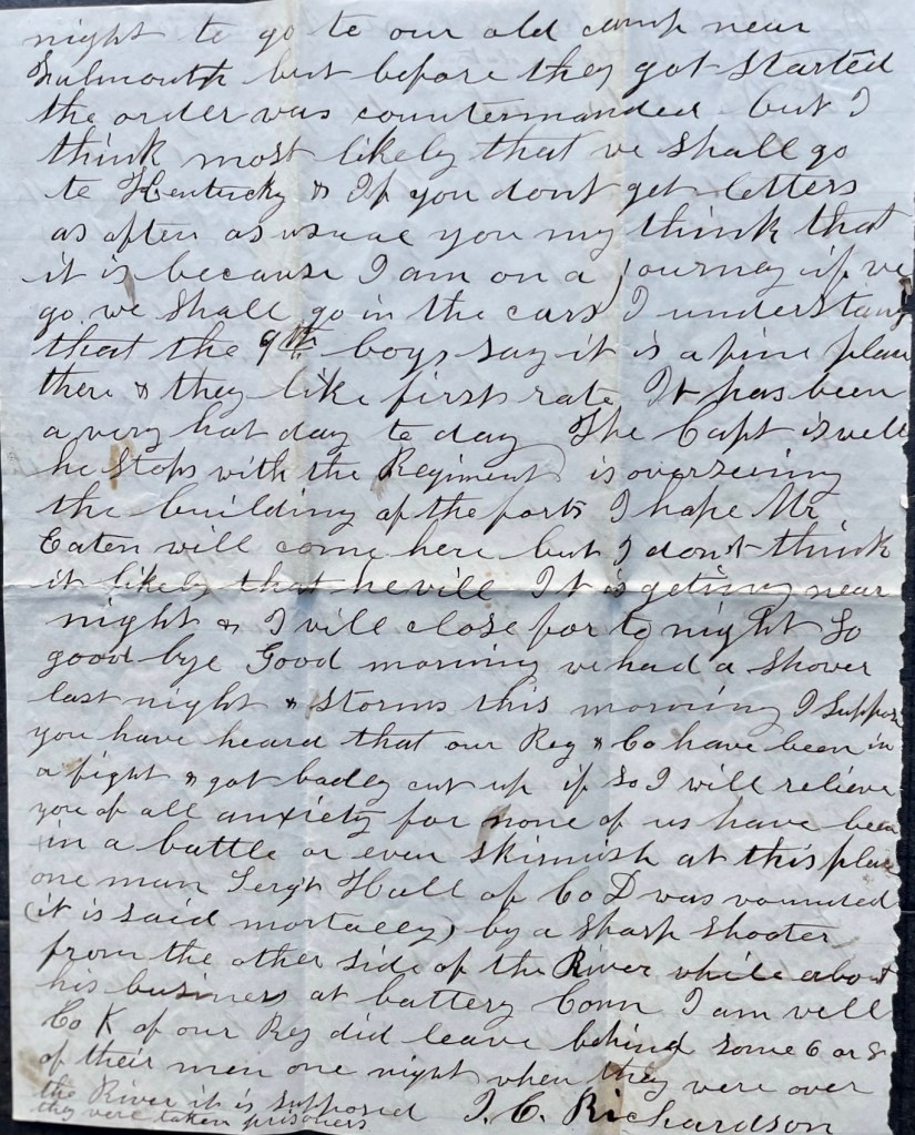 Good morning. We had a shower last night & storms this morning. I suppose you have heard that our regiment & company have been in a fight and got badly cut up. If so, I will relieve you of all anxiety for none of us have been in a battle or even skirmish at this place. One man, Sergt. [John A.] Hall of Co. D, was wounded (it is said mortally) by a sharp shooter from the other side of the river while about his business at Battery Connecticut. I am well. Co. K of our regiment did leave behind some 6 or 8 of their men one night when they were over the river. It is supposed they were taken prisoners. — I. C. Richardson