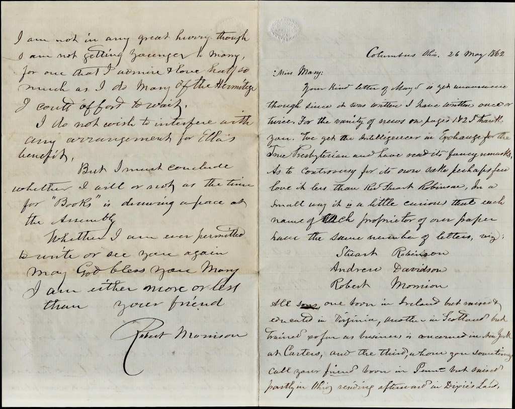 In his letter, Morrison speaks of the weekly newspaper recently purchased by himself, Andrew Davidson, and Stuart Robinson, which they named The True Presbyterian. The first issue of the publication was 3 April 1862. At the time, Morrison lived fifteen miles south of Louisville.