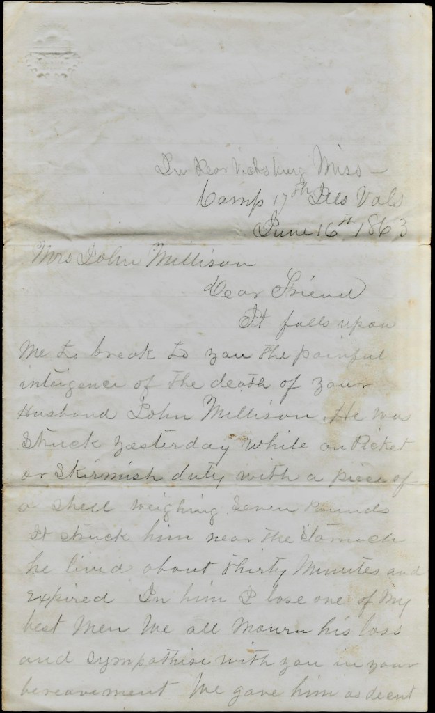 Dear friend, it falls upon me to break to you the painful intelligence of the death of your husband, John Millison. He was struck yesterday while on picket or skirmish duty with a piece of shell weighing seven pounds. It struck him near the stomach. He lived about thirty minutes and expired. In him I lose one of my best men. We all mourn his loss and sympathize with you in your bereavement. We gave him as decent a burial as most soldiers get at this time—better than some. I had a box made for him which is unusual at this time.