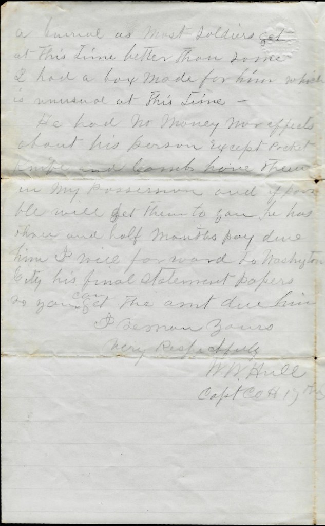 He had no money nor effects about his person except pocket knife and comb. Have them in my possession and if possible will get them to you. He has three and a half months pay due him. I will forward to Washington City his final statement papers so you can get the amount due him.