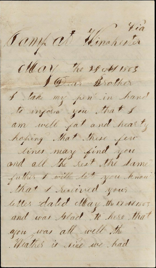 The following brief letter was written by Pvt. John L. Henry who mustered into Co. K (later transferred to Co. I) of the 123rd Ohio Volunteer. Infantry (OVI) in September 1862. Joining him in the same company was his older brother William B. Henry. The letter was penned in Winchester, Virginia, where the regiment was garrisoned under the command of Gen. Milroy from early March until June 1863 when they were attacked by Gen. Ewell’s columns in the 2nd Battle of Winchester on 13 June. After fighting two days, Milroy abandoned his fortifications and retreated but more than 2400 Federals were taken prisoner. For the Henry brothers and the 123rd OVI, the 2nd Battle of Winchester was their first engagement. William was wounded on the 15th and died on the 18th at Winchester. John was taken prisoner on the 15th and paroled a month later. He survived the war, mustering out at Camp Chase on 12 June 1865.