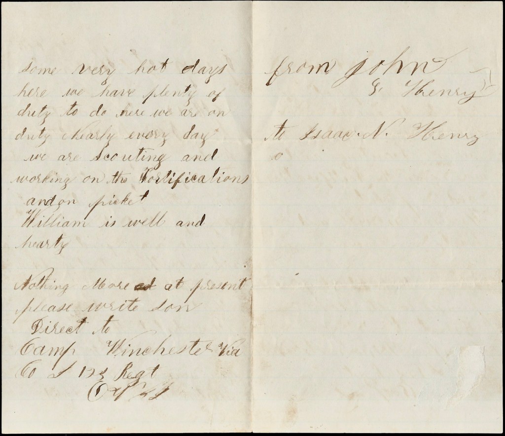 The weather is nice. We had some very hot days here. We have plenty of duty to do here. We are on duty nearly every day. We are scouting and working on the fortifications and on picket. William is well and hearty.