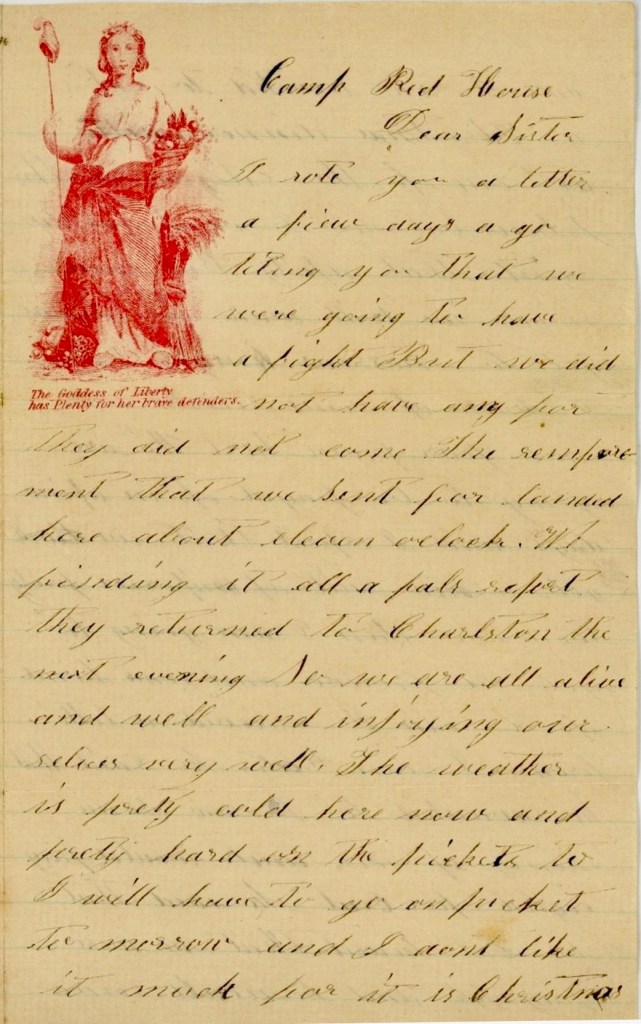 I wrote you a letter a few days ago telling you that we were going to have a fight but we did not have any for they did not come. The reinforcement that we sent for landed here about eleven o’clock. We finding it all a false report, they returned to Charleston the next evening. So we are all alive and well and enjoying ourselves very well.