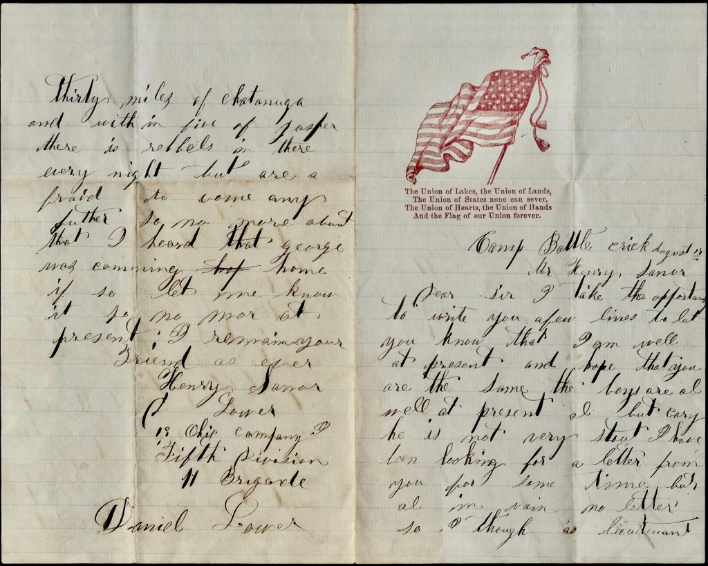 Daniel C. Lower (1842-1905) was the orphaned son of George W. Lower (1806-1864) and Mary Beaman Beaumont (1808-1856) of Columbiana county, Ohio. The recipient of this letter was Henry Sanor. He was probably the Henry Sanor (1827-1893) that married Daniel’s older sister Betsy Lower (1830-1913). Henry was a farmer in West Township, Columbiana county, Ohio. It should be noted that Daniel’s surname appears as “Laueere” in the regimental record for some reason.