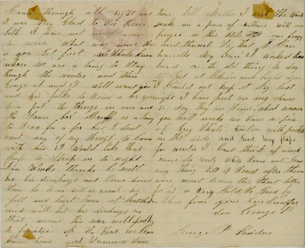 I will [send] some of my old letters home. They are too heavy to carry. Be sure and save them for me for I shall want them when I get home to read—George P. Risdon, now in the 10th Regt. Vermont Vols. Company H on the left wing of the battalion.