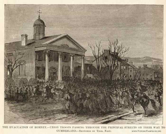 We then fell back to the South Green Spring Run. The next Friday we were ordered to journey a distance of 18 miles. We performed the journey in 7 hours carrying heavy knapsacks and three days rations besides 40 rounds of cartridges, I never was so completely exhausted in my life. Romney’s the county seat of Hampshire County, Western Virginia. It has been held alternately by both armies. Although beautifully located and well laid out and adorned with many fine buildings, it is in ruins a great deal of it. The jail is a mass of ruins. The court house—a fine building—has been used as a stable for cavalry horses. Also a fine church. I shall always regret that I did not pay it a visit and obtain some old relic. There are bushels of documents (so the boys say) on the floor in one room. Some of them date back to the time of George the Second—over two hundred years old.