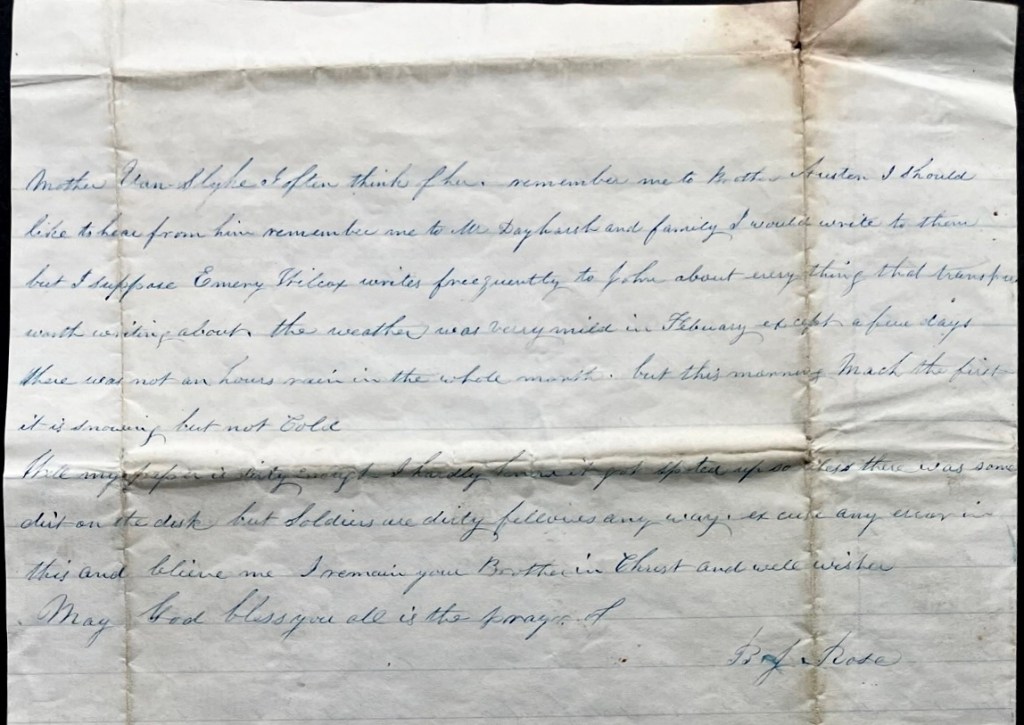 Well, my paper is dirty enough. I hardly [know] how it got spotted up so unless there was some dirt on the desk. But soldiers are dirty fellows anyway. Excuse any errors in this and believe me I remain your Brother in Christ and well wisher. May God bless you all is the prayer of, — B. J. Rose