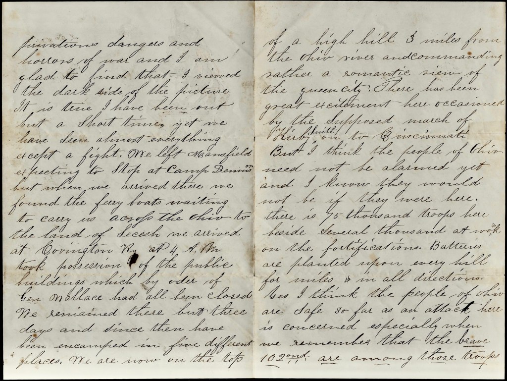 We are now on the top of a high hill 3 miles from the Ohio river and commanding rather a romantic view of the Queen City. There has been great excitement here occasioned by the supposed march of Kirby Smith on to Cincinnati, but I think the people of Ohio need not be alarmed yet, and I know they would not be if they were here. There is 75 thousand troops here beside several thousand at work on the fortifications. Batteries are planted upon every hill for miles in all directions. Yes, I think the people of Ohio are safe so far as an attack here is concerned—especially when we remember that the brave 102nd are among those troops.