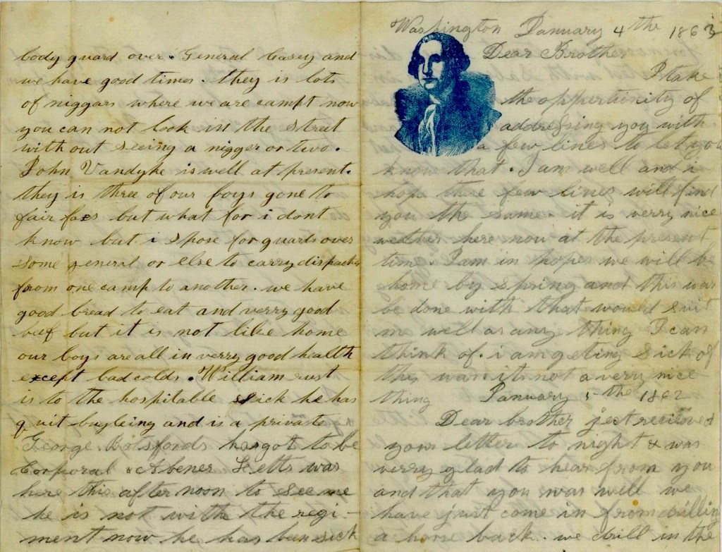 You better believe I have seen some of the greatest sights ever saw before. The Capitol is a great sight to see. We have got the position of body guard over General Casey and we have good times. They is lots of niggers where we are camped now. You cannot look in the street without seeing a nigger or two. John [T.] Van Dyke is well at present. They is three of our boys gone to Fairfax but what for I don’t know but I s’pose for guards over some general or else to carry dispatches from one camp to another.
