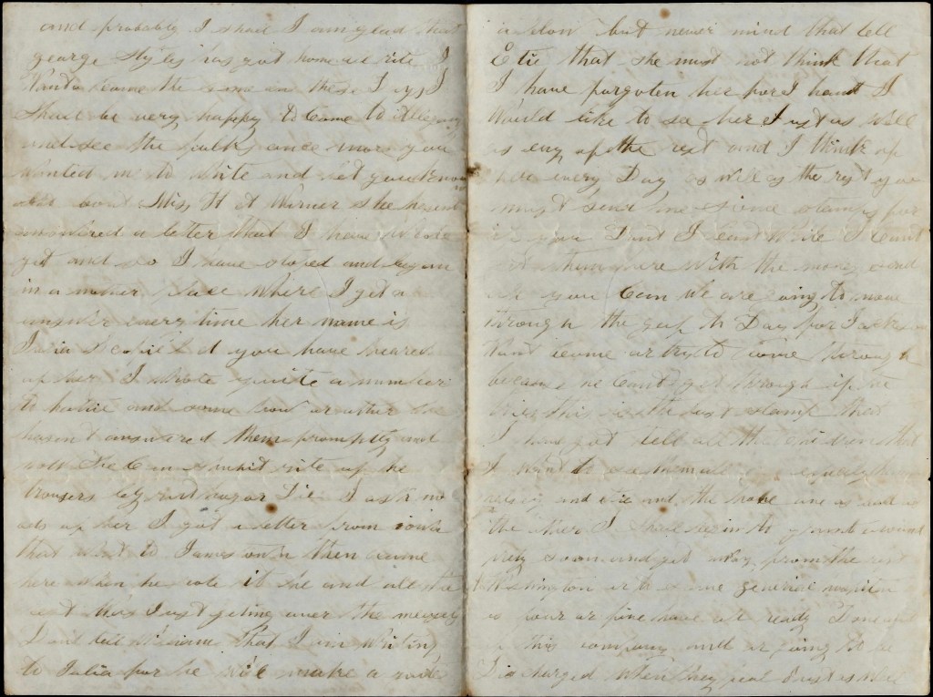 I got a letter from [Rowan?] that went to Jamestown, then came here. When he wrote it, he and all the rest was just getting over the measles. Don’t tell William that I am writing to Julia for he will make quite a blow, but never mind that. Tell Ettie that she must not think that I have forgotten her for I hant. I would like to see her just as well as any of the rest and I think of her every day as well as the rest. You must send me some stamps for if you don’t, I can’t write. I can’t get them here with the money. Send all you can.