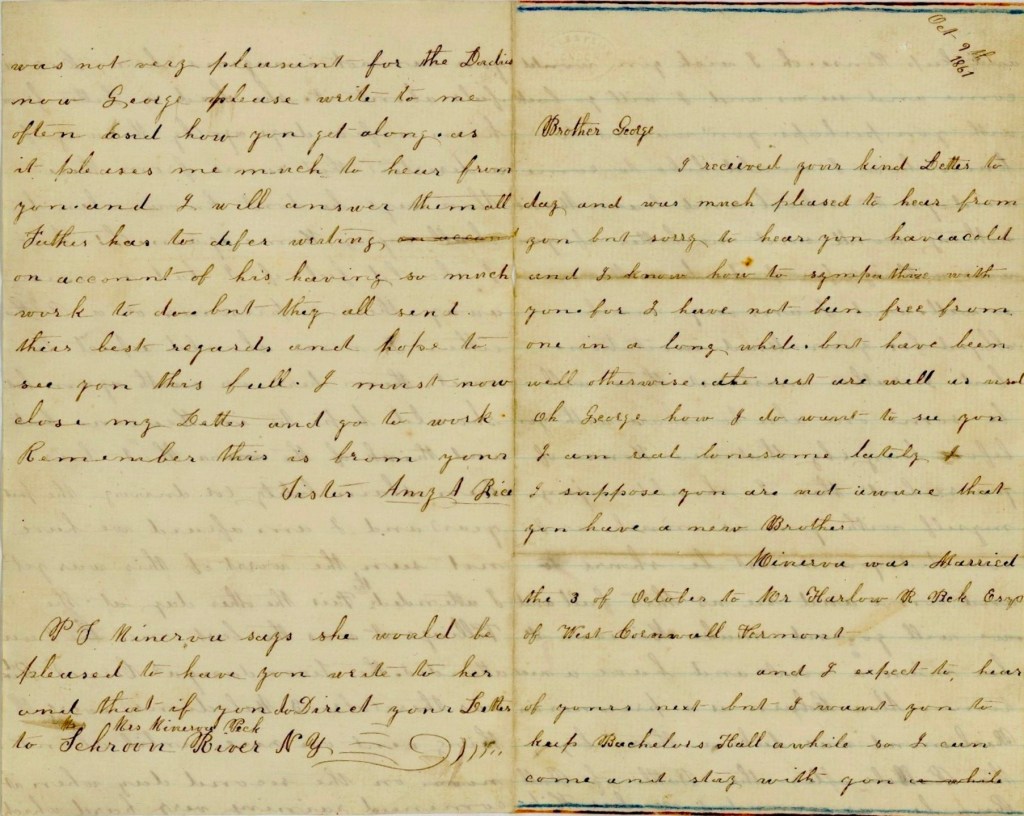 I received your kind letter today and was much pleased to hear from you but sorry to hear you have a cold and I know how to sympathize with you for I have not been free from one in a long while, but have been well otherwise. The rest are well as usual. Oh George, how I do want to see you. I am real lonesome lately. I suppose you are not aware that you have a new brother [in-law]. Minerva was married the 3rd of October to Mr. Harlow R[eeve] Peck, Esqr, of West Cornwall, Vermont—and I expect to hear of yours next. But I want you to keep Bachelor’s Hall awhile so I can come and stay with you and keep house. Oh, I wish you would come and see us and I will go back with you perhaps.