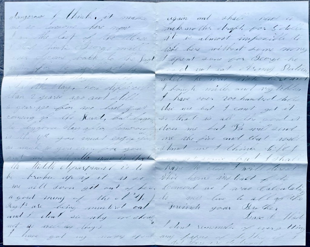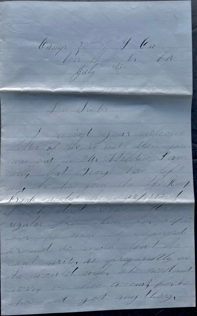 I received your welcome letter of the 24th inst. Then you was out to Mr. Webster’s. I am well but George has left me. He has gone to the hospital. Frank needn’t be surprised if she don’t receive letters regular from him for a spell for he will be changed around so much that he can’t write as frequently as he would wish. She need not worry on his account for he has not got anything dangerous, I think. It makes me so lonesome here now. I am the last of the three. I don’t think George will ever come back to the regiment again for he will get his discharge.