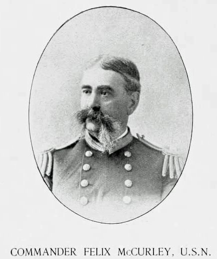4 According to U. S. Naval Records, Felix McCurley (1834-1896), a native of Baltimore, Md., had served in the merchant marine service before he enlisted in the US Navy in November 1861. He was appointed as Acting Master, Nov. 13, 1861; ordered to Winona; attached to W. G. Squadron, 1861-62; engaged in the attacks on Forts Jackson and St. Philip, April 24, 1862; in the attack and passage of Vicksburg batteries, June 28, 1862; engagement with ironclad Arkansas, above Vicksburg; attack and passage of Vicksburg batteries, July 15, 1862; skirmishes on Mississippi river; 1863-64, attached to steam sloop Lackawanna; attack and passage of Forts Morgan and Gaines; engagement in Mobile Bay with the ironclad Tennessee and other vessels of the Confederate fleet; promoted Acting Vol. Lieutenant, Nov. 9, 1864; attached to Chocura, W. G. Squadron, 1865; continued in regular service, and subsequently commissioned as Lieutenant, Lieut.-Commander and Commander.
