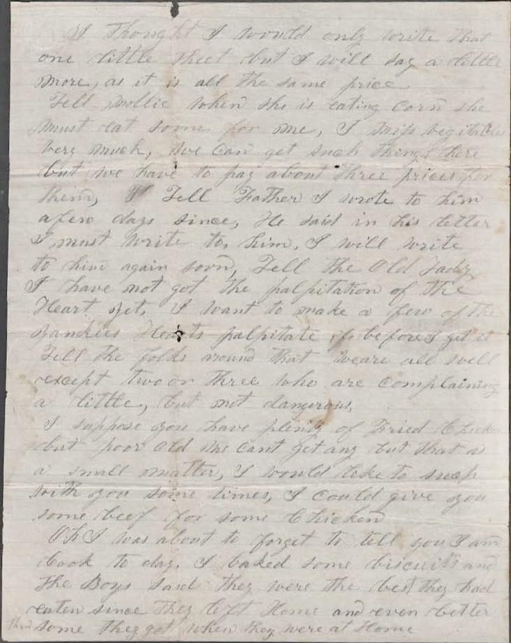 I thought I would only write that one little sheet but I will say a little more as it is all the same price. Tell Mollie when she is eating corn she must eat some for me. I miss vegetables very much. We can get such things here but we have to pay about three prices for them. Tell Father I wrote to him a few days since. He said in his letter I must write to him. I will write to him again soon. Tell the Old Lady I have not got the palpitation of the heart yet. I want to make a few of the Yankees hearts palpitate before i get it. Tell the folks around that we are all well except two or three who are complaining a little, but not dangerous.