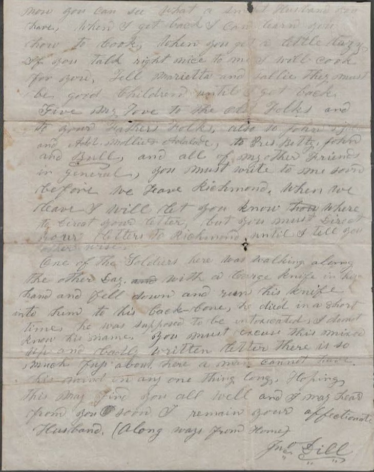 Give my love to the old folks and to your Father’s folks. Also to John & Fala [?] and Add., Mollie & Adalade, to Pres, Betty, John & Bull, and all of my other friends in general. You must write to me soon before we leave Richmond. When we leave, I will let you know where to direct your letter, but you must direct your letters to Richmond until I tell you otherwise.