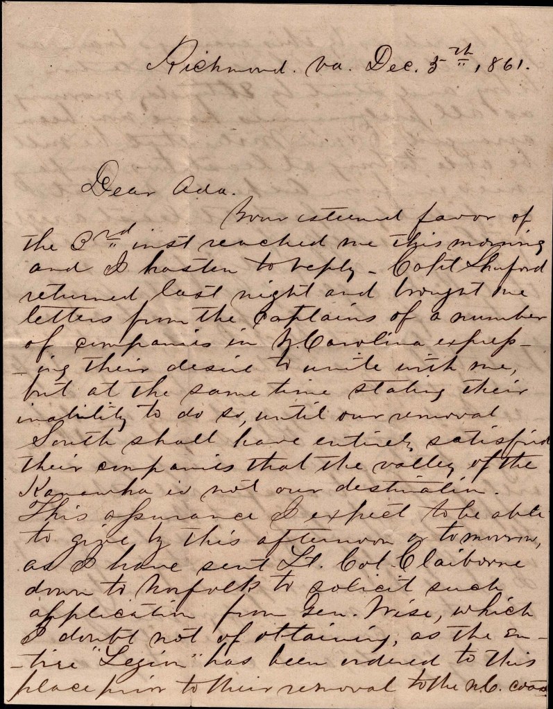 Your esteemed favor of the 3rd inst. reached me this morning and I hasten to reply. Capt. [Andrew H.] Shuford returned last night and brought me letters from the captains of a number of companies in North Carolina expressing their desire to unite with me, but at the same time stating their inability to do so until our removal South shall have entirely satisfied their companies that the valley of the Kanawha is not our destination. This assurance I expect to be able to give by this afternoon or tomorrow as I have sent Lt. Col. Claiborne down to Norfolk to solicit such application from Gen. Wise, which I doubt not of obtaining as the entire “Legion” has been ordered to this place prior to their removal to the N. C. coast. If he returns by this evening’s train, as I expect he will, it is my intention to try and start by Saturday morning, as all preliminaries have now been arranged.