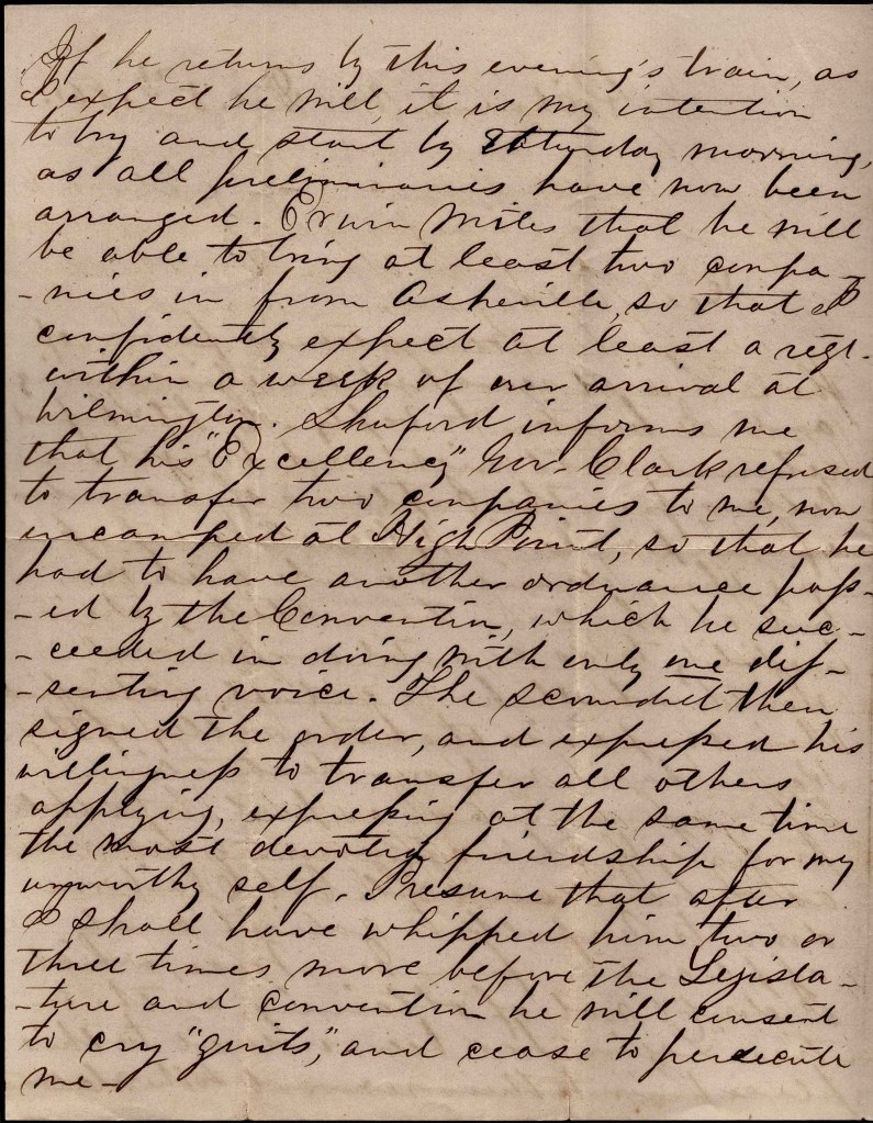 Erwin writes that he will be able to bring at least two companies in from Asheville so that I confidently expect at least a regiment within a week of our arrival at Wilmington. Shuford informs me that his “Excellency” Gov. [Henry Toole] Clark refused to transfer two companies to me now encamped at High Point so that he had to have another ordnance passed by the Convention which he succeeded in doing with only one dissenting voice. The scoundrel then signed the order and expressed his willingness to transfer all others applying, expressing at the same time the most devoted friendship for my unworthy self. Presume that after I shall have whipped him two or three times more before the Legislature and Convention he will consent to cry “quits” and cease to persecute me.